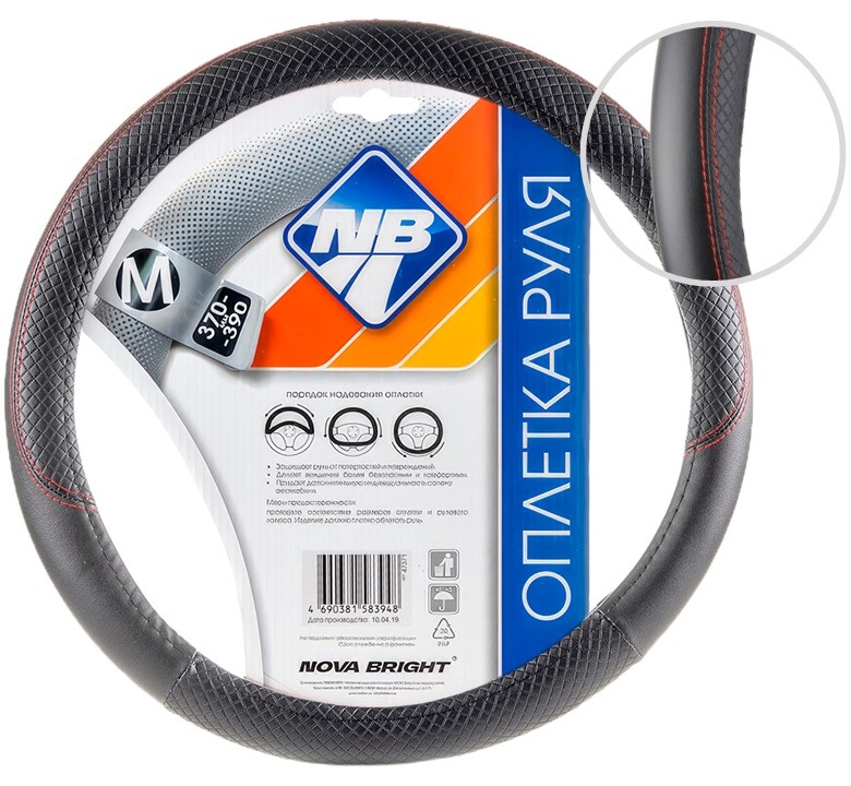 Оплетка рулевого колеса "Nova Bright" (M) экокожа, черная с тисненными вставками и красной прострочкой