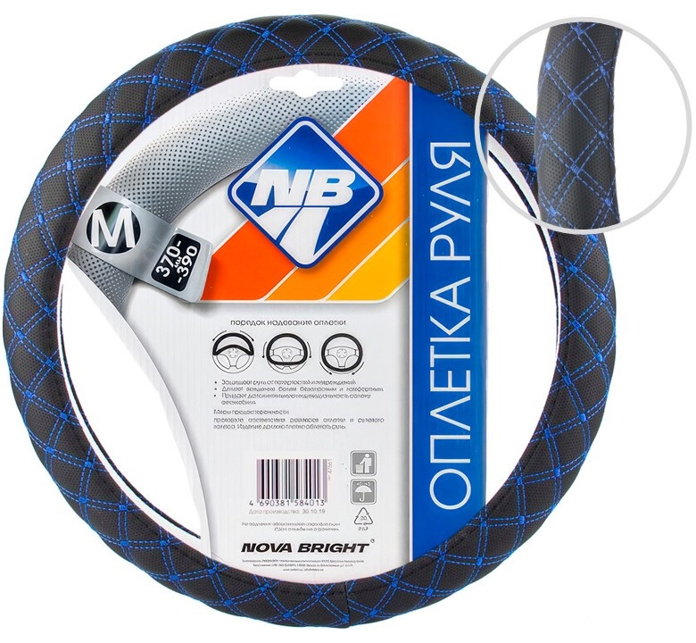 Оплетка рулевого колеса "Nova Bright" (M) экокожа, черная с перфорированными синими вставками, синяя строчка