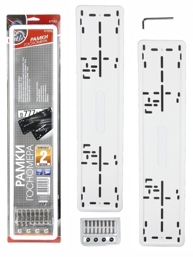 Рамка номерного знака "King" металлическая с силиконовой прокладкой (с набором для крепления, 21 предм.), белая, 2 шт.