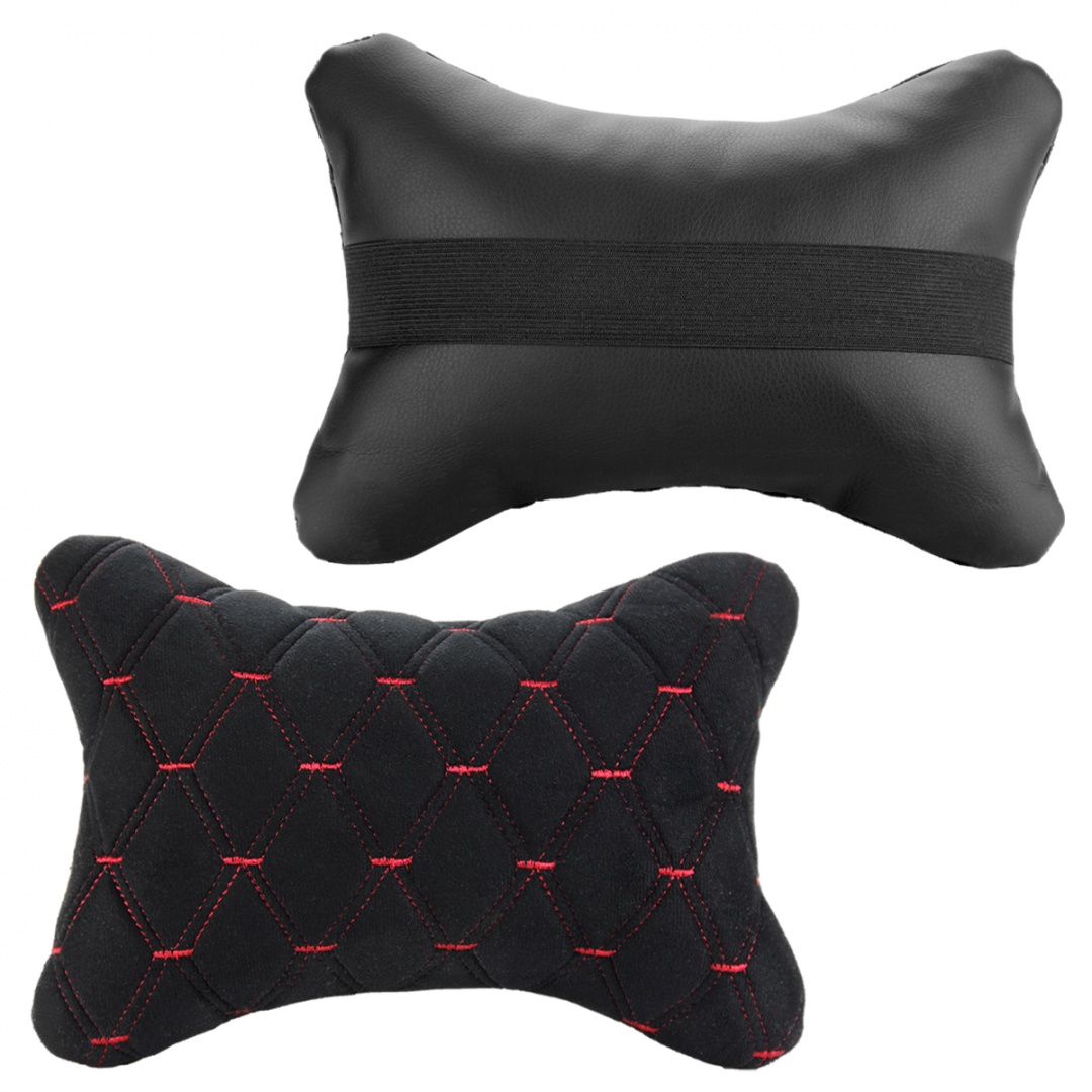 Подушка-подголовник на сиденье "косточка", черная с прострочкой красной ромбиками (26х17см)