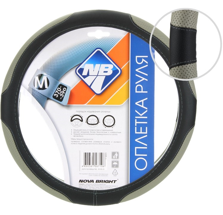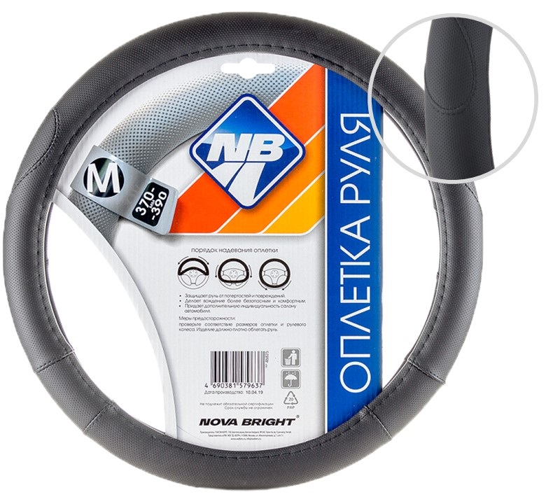 Оплетка рулевого колеса "Nova Bright" (M) экокожа, черная с перфорированными серыми вставками, серая строчка