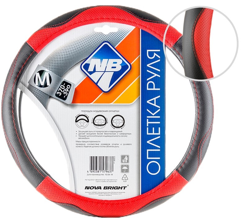 Оплетка рулевого колеса "Nova Bright" (M) экокожа, черная с красными перфорированными вставками, красная строчка