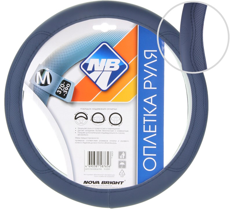Оплетка рулевого колеса "Nova Bright" (М) экокожа, синяя с узорами синей нитью и перфорацией