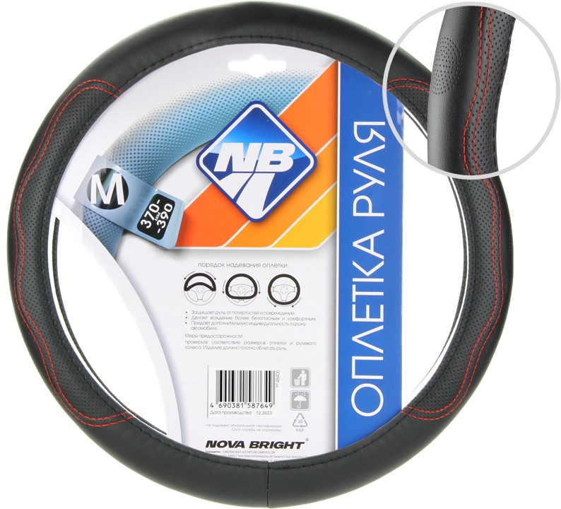 Оплетка рулевого колеса "Nova Bright" (М) экокожа, черная перфорированная, красная прострочка