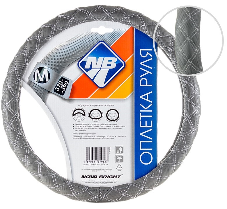 Оплетка рулевого колеса "Nova Bright" (M) экокожа, серая с прострочкой ромбиками