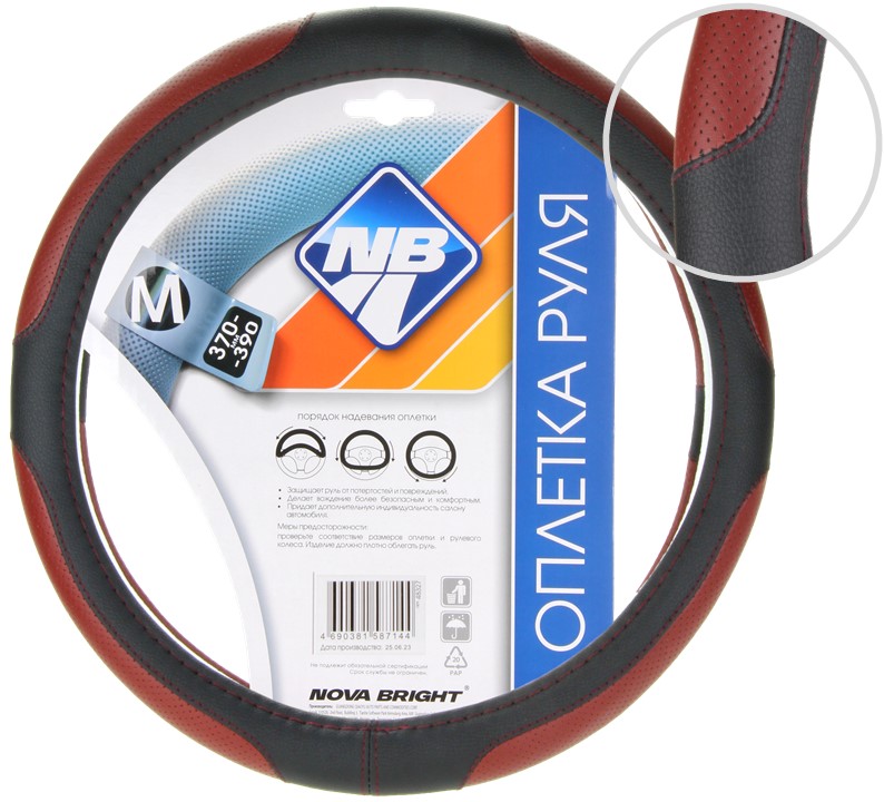 Оплетка рулевого колеса "Nova Bright" (M) экокожа, черная с перфорированными бордовыми вставками, бордовая строчка