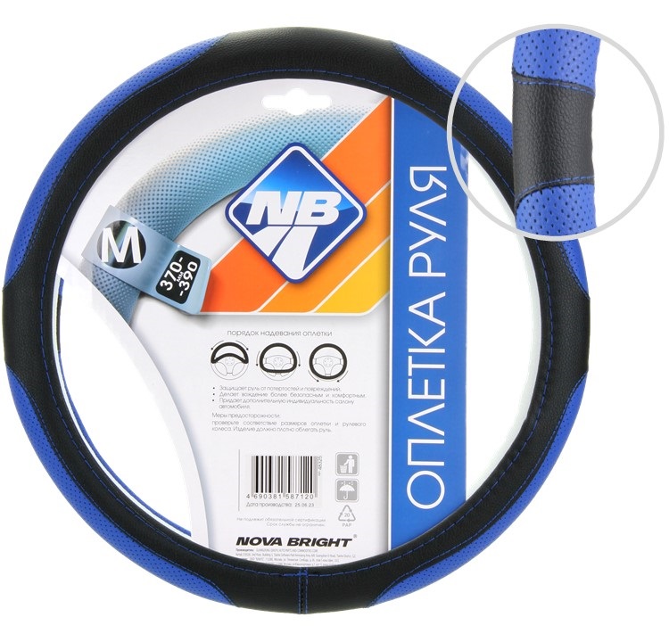 Оплетка рулевого колеса "Nova Bright" (M) экокожа, черная с перфорированными синими вставками, синяя строчка